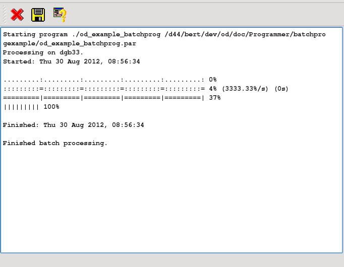 Batch programs in OpendTectWhat we call a 'batch program' is usually called 'console program' on Windows. All our batch programs accept a single parameter file as argument, and optionally '-bg' if it has to run in the background (it will be ignored on Windows though). Rather than specifying a 'main', you have to specify: bool BatchProgram::go(std::ostream&); The Log file: window other possibilities are 'stdout' or a file name.