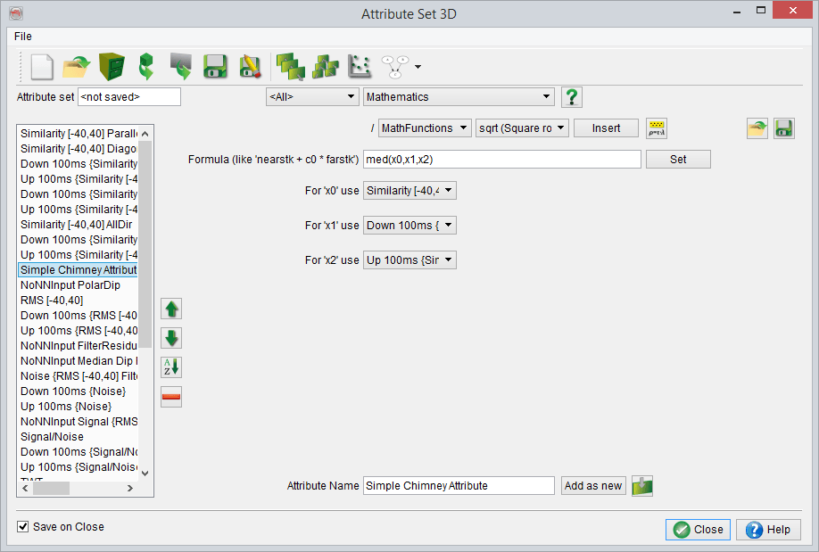 This attribute set is meant for usage in a neural network. A key feature of this set is that most attributes are extracted in three separate time windows: one above, one centered around, and one below the point of investigation. In this way, we utilize the fact that chimneys are vertical bodies with a certain dimension. It is expected that similar seismic characteristics of Chimneys are present in all three windows and thus a correlation exists between these three windows. The neural network will recognize this and will thus be able to distinguish between real chimneys and other (more localized) features.