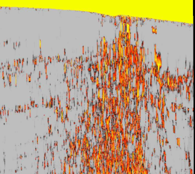 In this section, we compare the original seismic in Figure 1 with the results of chimney detecting neural network displayed in Figure 3. The main body of the chimney and its sidetracks are picked up, while other features (faults, low similarity/low energy layers) are rejected. In addition we compare a similarity attribute in Figure 2 with the neural network results in Figure 3. The similarity attribute highlights the chimney, but also other (unwanted) features are enhanced. The multi-attribute neural network is able to make a clear distinction between chimney and non-chimney. Neural networks with the NN ChimneyCube attribute set as input can (and in general will) also detect other fluid migration paths, e.g. dewatering structures.