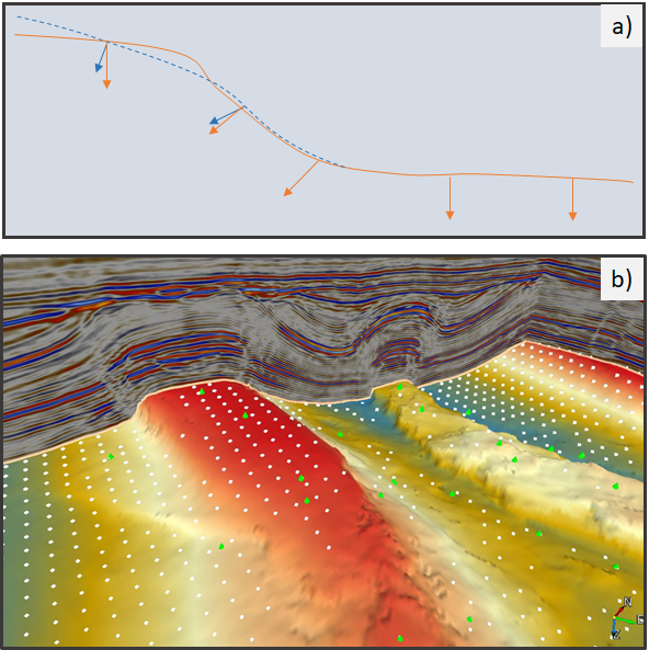 Figure 1 Principle of the hybrid tracker: 1a) An inversion algorithm minimizes the error between horizon grid dips (blue) and pre-computed seismic dips (orange); 1b) The horizon grid is tied to manually picked seed positions (green dots) and auto-generated seeds added by the similarity-based auto-tracker after each inversion cycle (white dots).