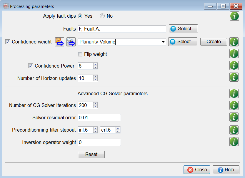 - A confidence weight volume is optional. It is only required if the interval is faulted. If the given volume has higher weights (e.g. near to 1) at the fault weights, you may flip the weights (1 – input) to minimize the effect of erroneous dips at fault locations.