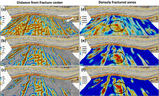 Figure 2. Fracture Density (right) and Fracture Proximity (left) attributes computed from Thinned Fault Likelihood attribute.