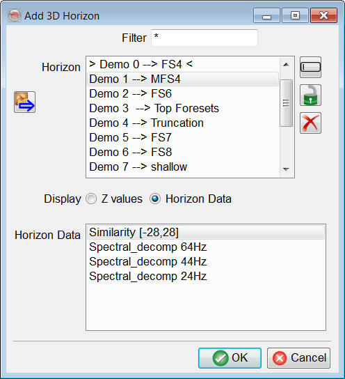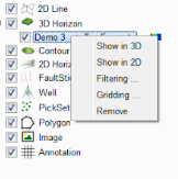 Show in 3D/2D: Shows the selected horizon in a 3D scene or a 2D Viewer. Filtering / Gridding: Each horizon can be individually filtered or gridded by following the right-click menu or from the main menu of the basemap (see under Processing). Remove: Only removes the horizon display from the basemap. |