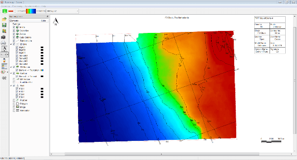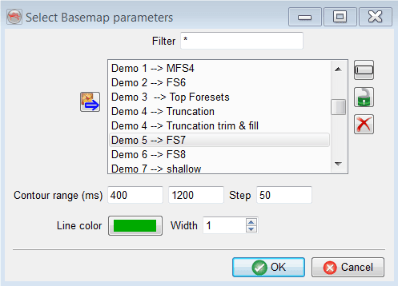 Contoured display of a horizon grid can be added using this tree item. The following window shows the contour range, contour step, and line properties for a selected window. By default, contours are plotted on top of the 3D horizon.