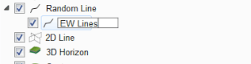 In the basemap, random lines can be created as a group or individual sub-elements. Once an individual random line is added in the tree, a user has to click on the basemap to draw its geometry. Once finished, double click to confirm the geometry. The geometry can be manipulated by dragging the line nodes on the basemap. If the data is preloaded, the random line will be interactively displayed in the 3D scene.