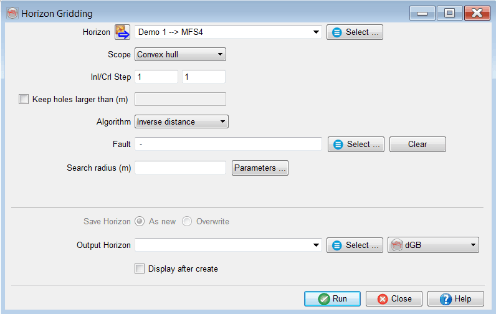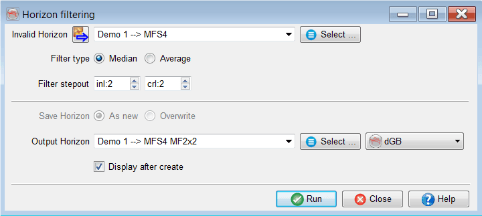 Filtering: A selected horizon grid can be filtered within the basemap. Median filtered is preferred if you intend to de-spike a horizon grid. Average filter is considered as a general smoothing filter. If you intend to display the resultant grid then check the Display after create option.