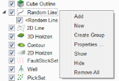To add one or more wells in the basemap use the right-click in the basemap tree. Just like other elements (e.g. Random lines / 2D lines), wells can be grouped by creating a group and adding a set of wells in it. If you intend to create such a thing, we recommend saving the basemap.