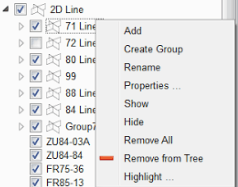 A 2D line group has its own right-click menu to manipulate the displays. Most of the options are self-explanatory. Highlight is the only option that could be used for QC purposes, which highlights the 2D lines on the basemap that have dataset.
