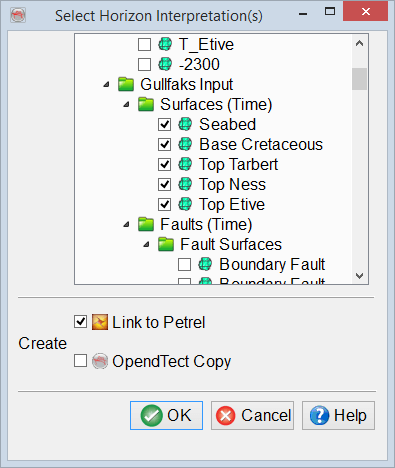 Select Horizon Interpretation(s) window allows to select 3D horizons and surfaces from Petrel project and create either Link to Petrel or OpendTect Copy.