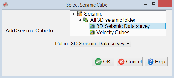 Select Seismic Cube window allows to select 3D seismic data from Petrel project and create either Link to Petrel or OpendTect Copy. The tree view and the drop-down menus offer alternative ways to select data from a Petrel project.