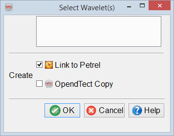 Select Wavelet(s) window allows to select wavelets from Petrel project and create either Link to Petrel or OpendTect Copy.