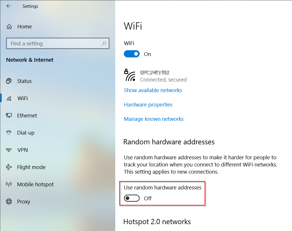 Figure: Random hardware addresses option in Windows Settings > Network & Internet > WiFi
