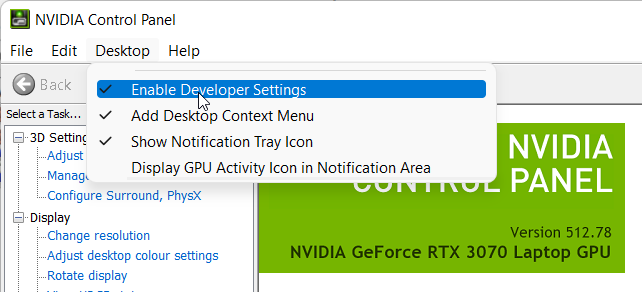3. From the tray select DeveloperManage GPU Perfomance Counters