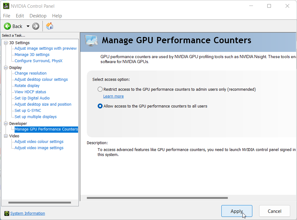 4. Select Allow access to the GPU performance counter to all users to enable unrestricted profiling