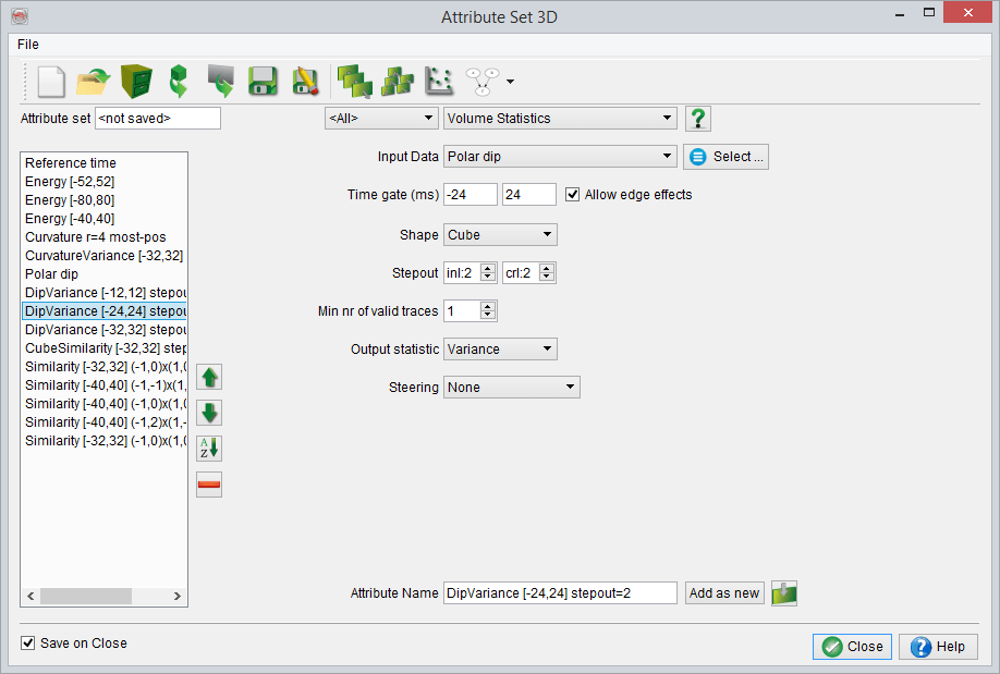 This attribute set is meant for usage in a neural network. It is focused on detecting the generally chaotic, low-energy character of salt on seismic data. Because salt has many appearances, there are several possibilities for optimization. For example, one can focus on salt layers (horizontally oriented ) or salt domes (vertically oriented). For layers, you can consider to decrease vertical window lengths while for domes the vertical window lengths can be increased. Adding frequency attributes can also be considered since most salt bodies exhibit a different frequency content as compared to their surroundings.