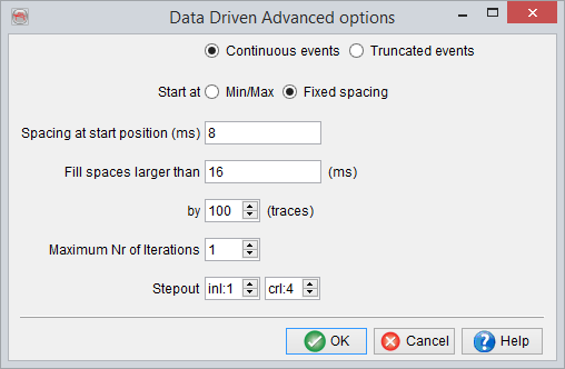 Fill spaces larger than (ms) or by (traces): This is used to specify the minimum allowed gap vertical (in ms / m / ft) or by distance (m / ft) to be filled in the subsequent defined iterations.