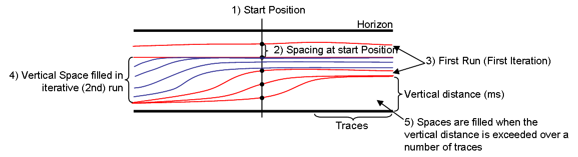 At the start position (1) numerous horizons are initiated at a user defined interval (2). Normally, the sample rate is used here in order to initiate a horizon at every sample. These horizons are tracked from the start position outward within the whole extend of the survey (3). When the horizons diverge large vertical spaces between the horizons are created, which are filled in iterative runs (4). To prevent very small vertical spaces to be filled (with horizons that are present in the whole survey) the spaces are defined by a vertical setting as well as a horizontal (5). A vertical space is filled when the vertical distance between the horizons exceeds a user specified amount over a lateral extend -the user defined number of traces-.