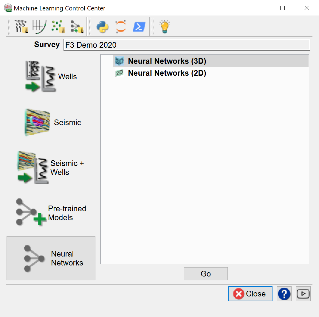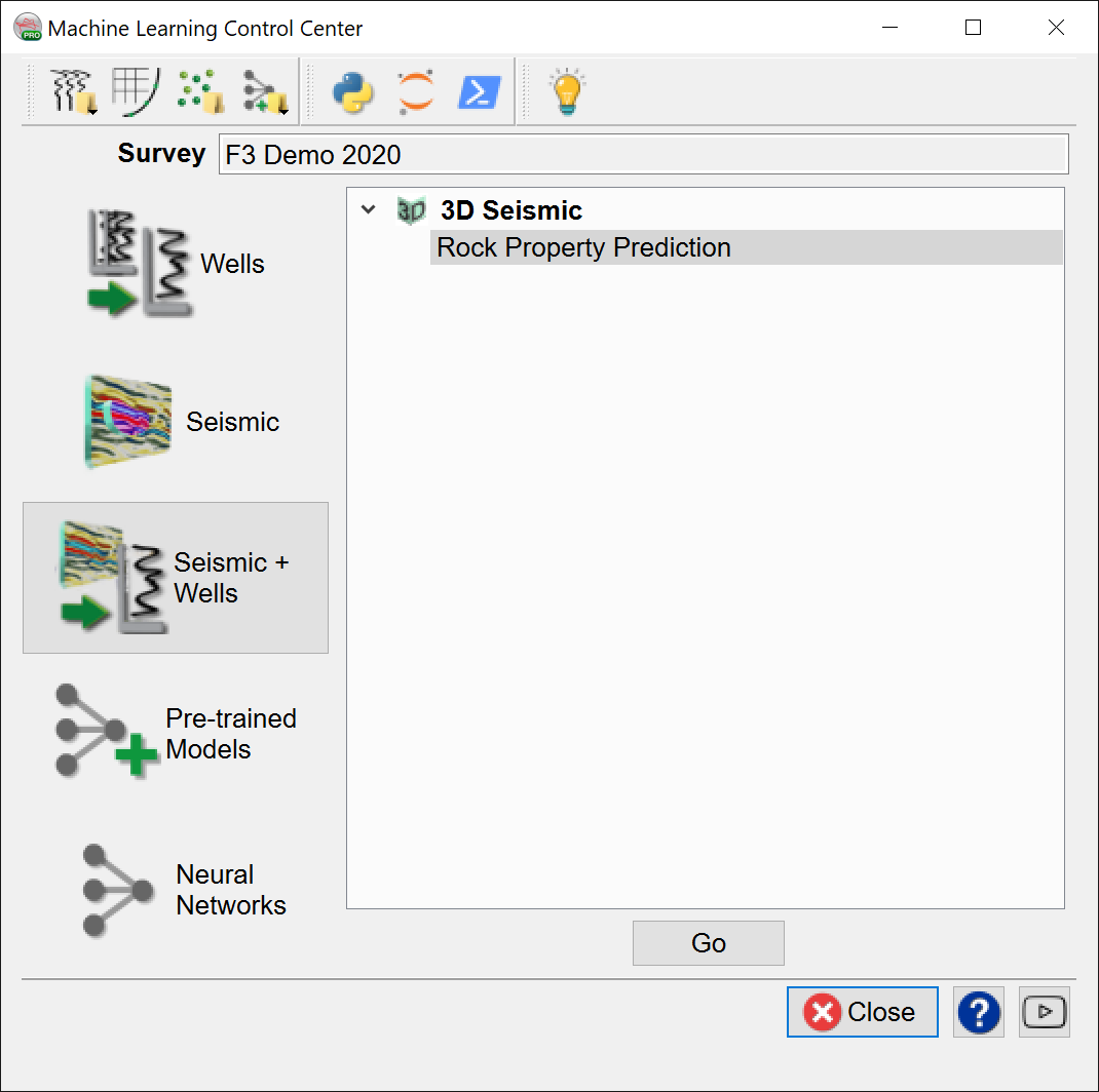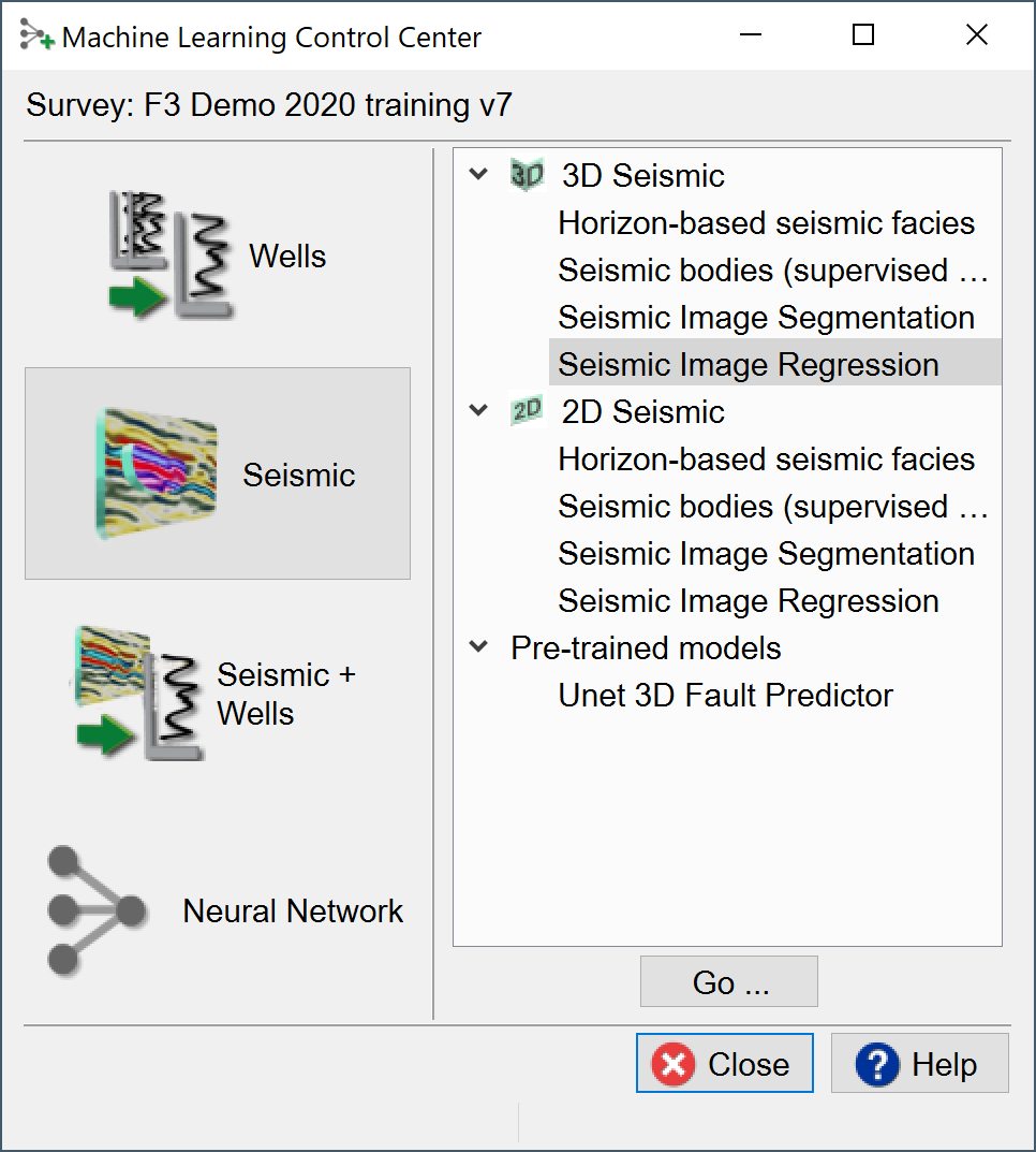 First we select the type of data we are working with: Wells, Seismic, Seismic + Wells, or Neural Networks. The latter refers to the pre-existing Neural Networks plugin that is now started from inside the ML control center.