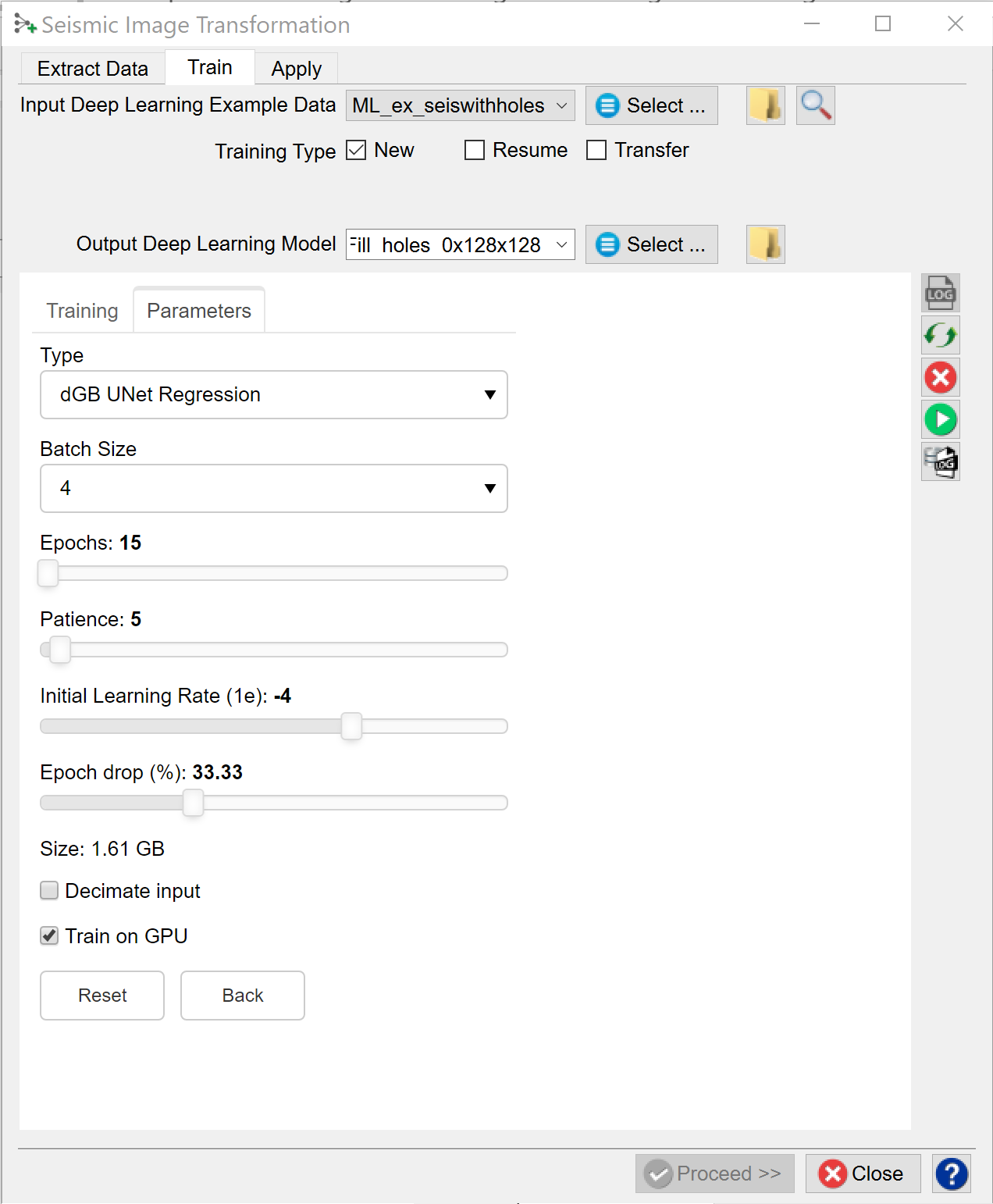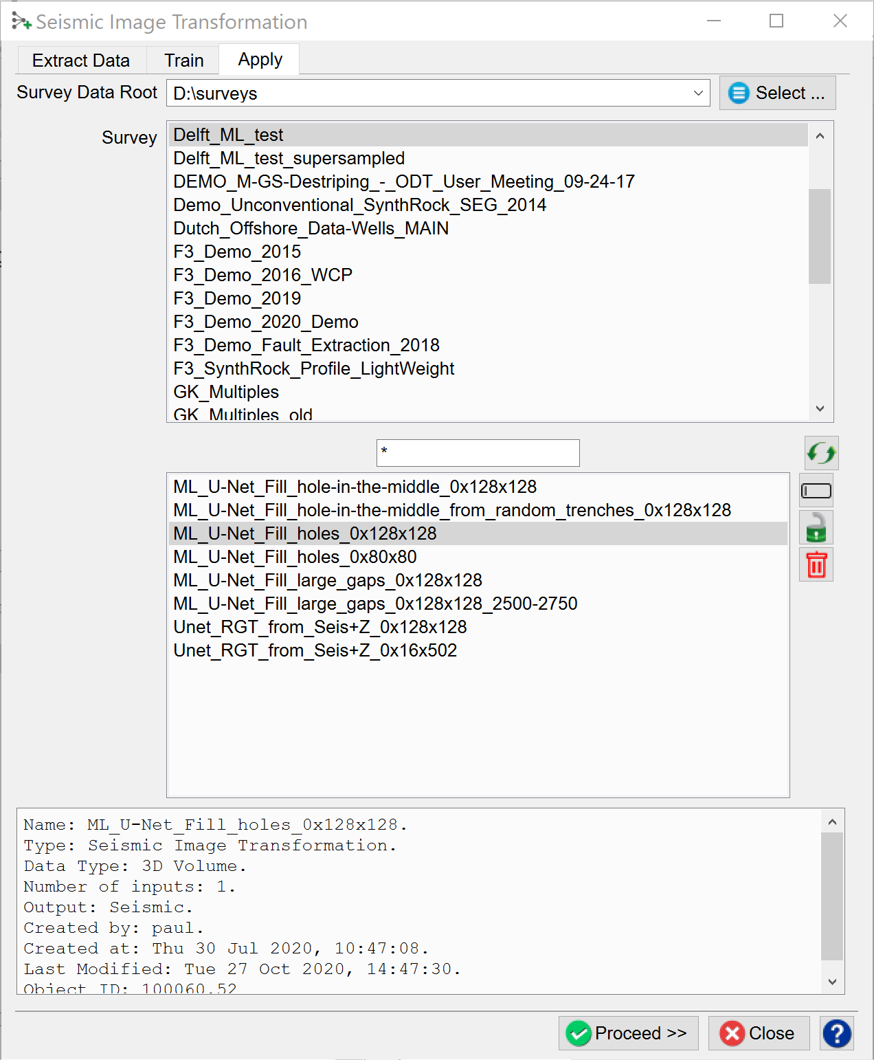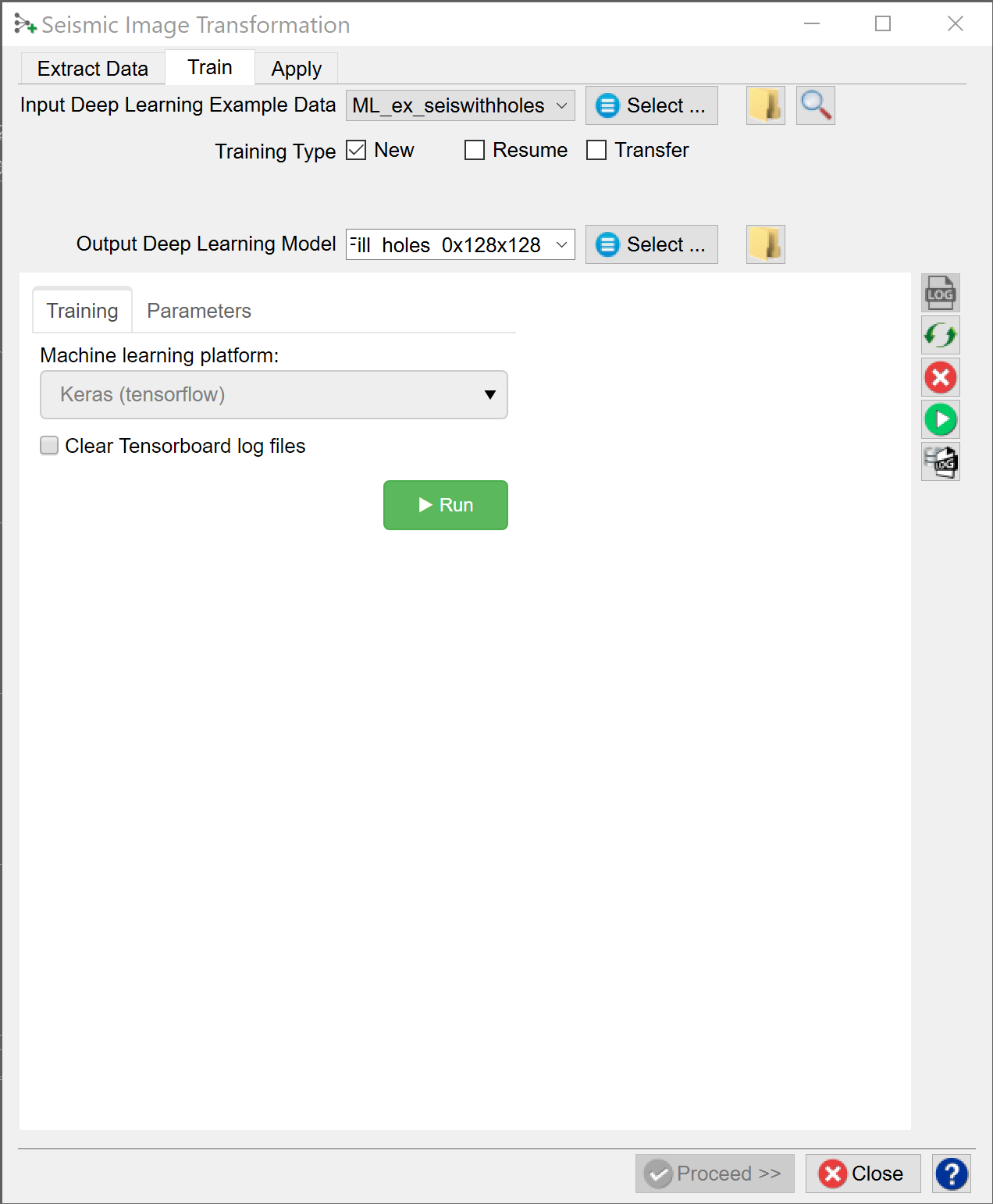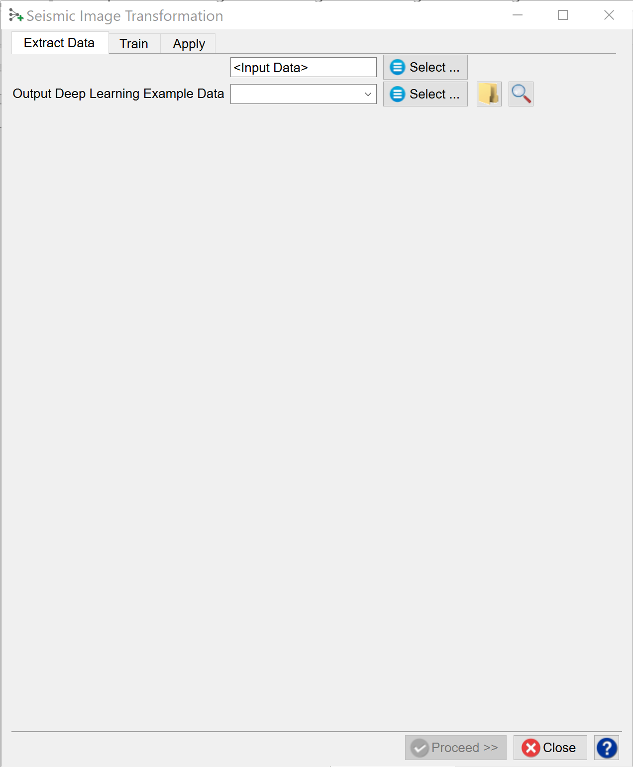 When this process is finished you are back in the “Seismic Image Transformation” start window. The Proceed button has turned green. Press it to continue to the Training tab.