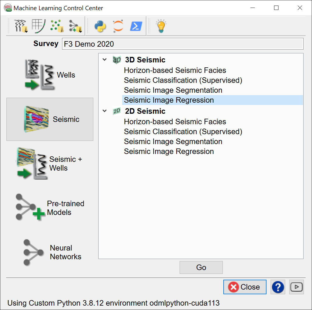 After the training data is selected the UI shows which models are available. For seismic image workflows we use Keras (TensorFlow).