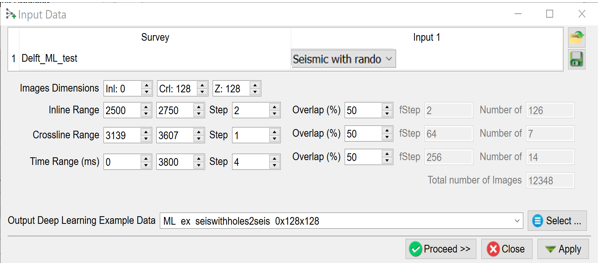 The examples (images) are extracted from the specified Inline, Crossline and Time Ranges. Step is the sampling rate in the bin (time) directions. The Overlap determines how much overlap there is between neighboring images. The total number of images is given on the right-hand side of the window. You can control this number by playing with the ranges and overlap parameters.