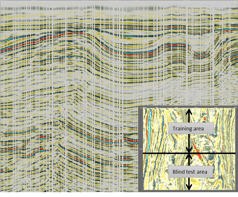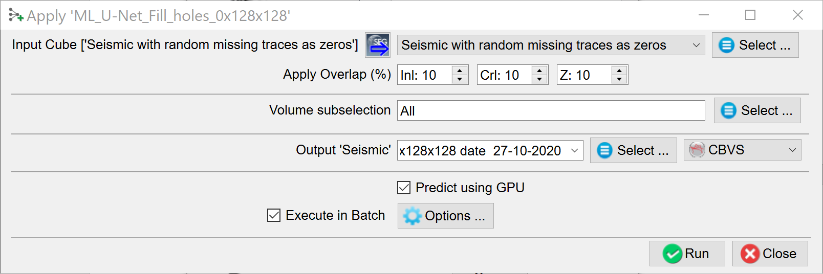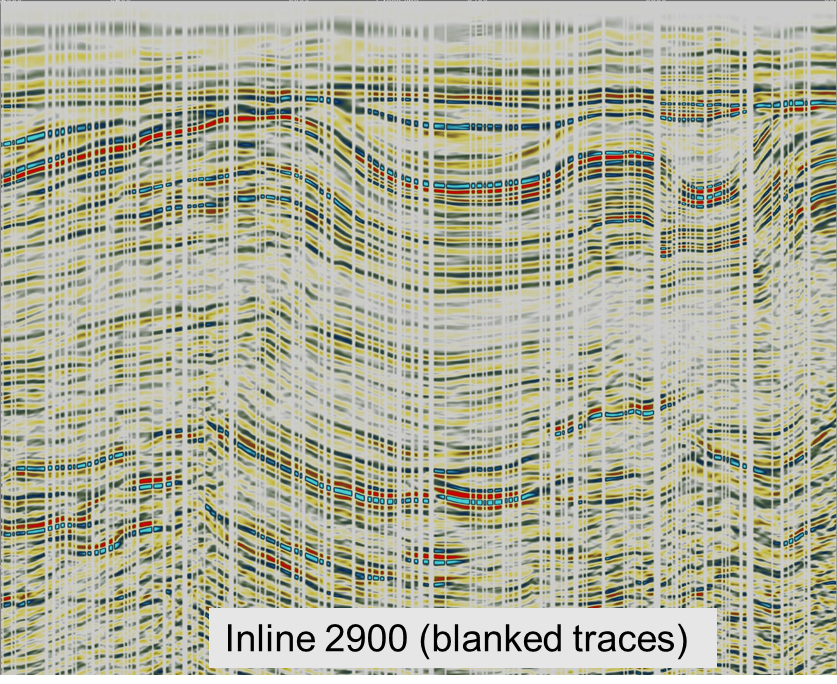 Randomly blanked traces. To train our 2D Unet regression model we create a data set with 33% randomly blanked traces. From this cube we extract examples for training in a restricted area (insert time-slice). The trained model is applied to the entire volume, whereby the area from which no examples are extracted acts as blind test area. The real value is of course when we apply the trained model to an area with real missing traces (which we don’t have in this case). Random blanking (replacing the values with hard zeros) is done in OpendTect’s Attribute engine and can be done in different ways. In this case: 1) Math attribute with formula: “randg(1)”. This generates random values with a Gaussian distribution and 1 standard deviation; 2) Apply this attribute to a horizon and save as horizon data; 3) Horizon attribute that retrieves the random values from the saved horizon data. A Horizon attribute replaces a value at an inline, crossline position with the value extracted from the given horizon; 4) Math attribute with formula: “abs(value)> 1 ? 0: seis”. We assign the retrieved horizon data to the variable “value” and the seismic data to “seis”. This attribute assigns values larger than the absolute value of 1 standard deviation to zero while all other values are given the value of the seismic data.