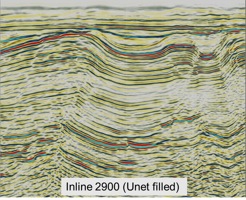 You can run on GPU or CPU depending on the Predict using GPU toggle. Running the application on a GPU is many times faster than running it on a CPU. Press Run to create the desired outputs. The images below compare the original data with the Unet reconstructed result from input with blanked traced. The line is extracted from the blind test area.