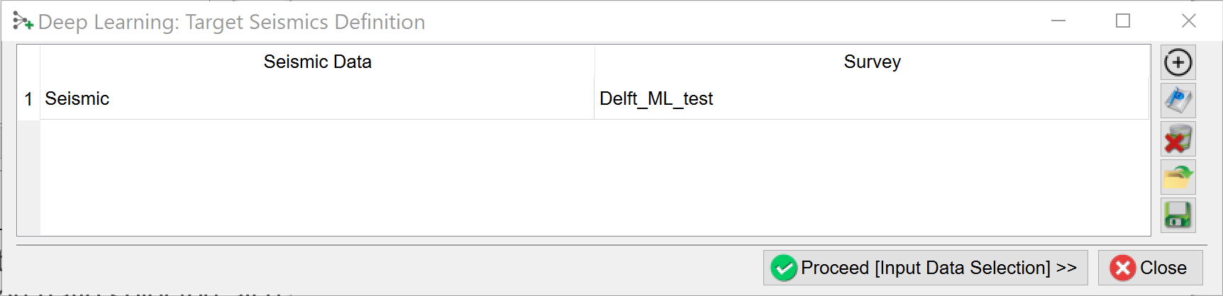The “Deep Learning Target Seismic Definition” window pops up. Press the + icon and select the target seismic volume containing the labels. In the example this volume is called “Seismic”.