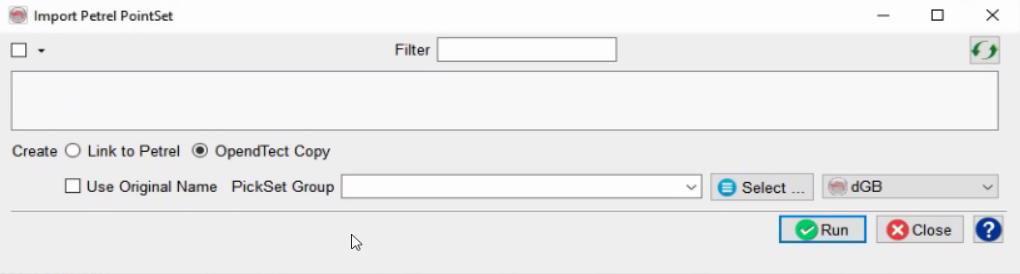 Import Pointsets (Polygons) window allows to select Pointsets (Polygons) from Petrel* project and create either Link to Petrel* or OpendTect Copy.