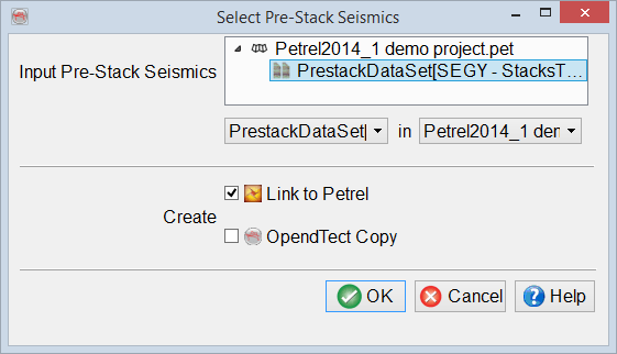 Select Prestack Seismics window allows to select 3D prestack seismic data from Petrel* project and create either Link to Petrel* or OpendTect Copy. The tree view and the drop-down menus offer alternative ways to select data from a Petrel* project.