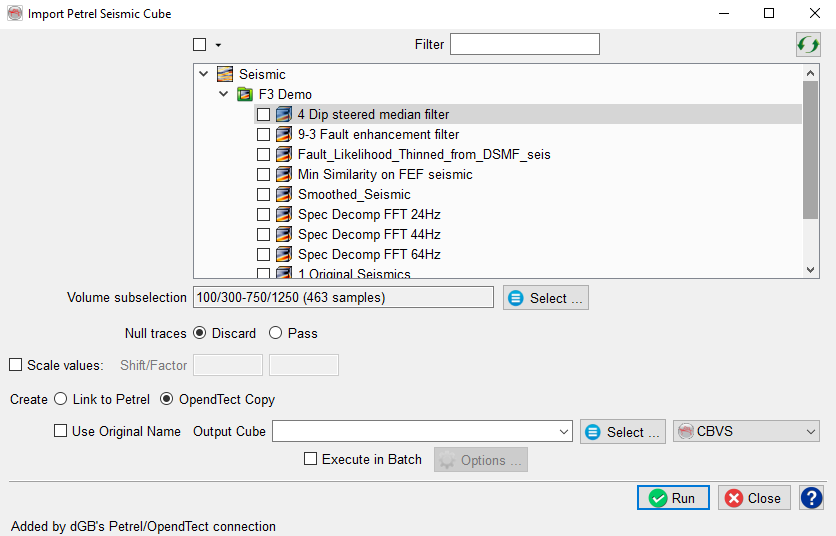 Select Seismic Cube window allows to select 3D seismic data from Petrel* project and create either Link to Petrel* or OpendTect Copy. The tree view and the drop-down menus offer alternative ways to select data from a Petrel* project.
