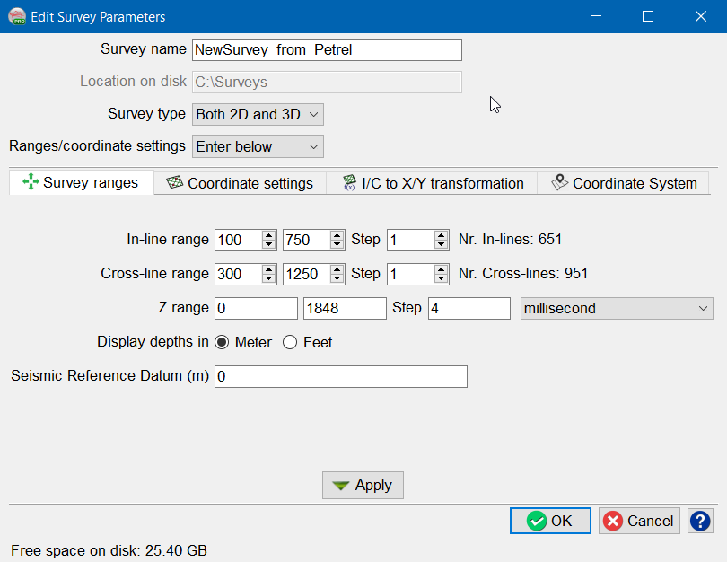 An OpendTect survey can be quickly set up from an existing Petrel* project. Go to Survey > Select/Setup or click on