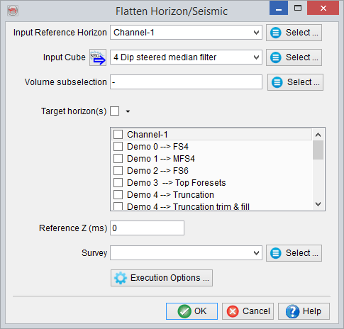The Target Horizon(s) are selected as these horizons are used as input in the HorizonCube, for building the framework. In the list one or more horizons can be transformed in the selected output i.e. a flattened survey (give a name in the Select Survey field).
