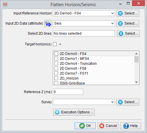 The same workflow can be applied for a 2D survey. If the window is launched in an active 2D survey, the 2D lines and the corresponding 2D horizons can be flattened using a reference horizon. The reference horizon defines a flattening datum with a given Reference Z value. This is selected from the Input Reference Horizon field. The 2D lines available in a Lineset are selected for the Lineset/Line Name option by pressing the select button.
