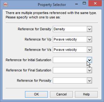 When the aforementioned icon is pressed the first time, the user has to specify various rock properties defined in the pseudo-wells, as required by the Gassmann’s fluid replacement algorithm. They are Vp, Vs, Density, initial Water Saturation, final Water Saturation and Porosity.