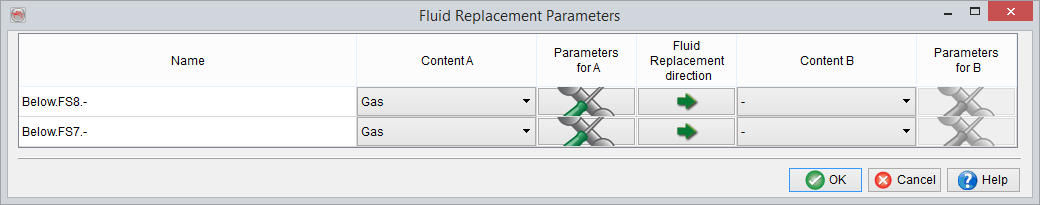 icon. Now, in the above example, the initial fluid content in the two intervals (below the two well markers) is brine and is denoted by a '-' sign, by default. As the initial fluid content A is brine, the parameter specification icon has grayed out. The final fluid content, B, is gas and therefore clicking on the above mentioned icon, pops-up the following window. It should be noted that the direction of fluid replacement is from brine to gas, the direction can be changed by clicking on the