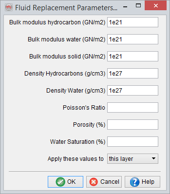 The top five parameters have to be filled in. If the Poisson's Ratio, Porosity and Water Saturation information is available in the layer model, they can be left blank. In absence of this information, a constant values can be filled in for these three parameters. Finally, these parameters can be defined for the layer in consideration, similar layers or all the layers having fluid content defined.
