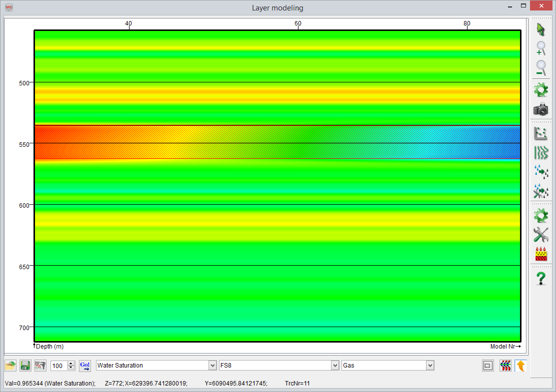 Below is an example of water saturation modeling, based on F03-4 well of F3 Demo data-set, wherein a gas column of thickness 30m is attached below the FS8 marker. Here modeling is done to decrease the logged water saturation from 100% to 90%, from left to right to replace with gas (i.e. gas saturation increases from 0% to 10%). Afterward, fluid replacement is applied to compute the change in seismic response corresponding to the change in fluid fill.