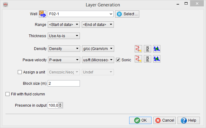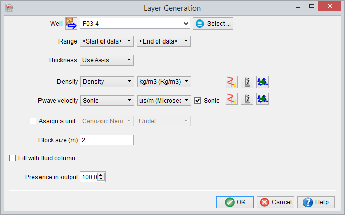 And selecting a well will allow auto-input of any available logs. Well-log based section can be either full or part of well log data, which has been upscaled/blocked at a constant size. This option is recommended for modeling a realistic overburden which is required for ray-tracing when working with prestack data. See following example for F03-4: