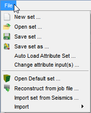 OpendTect works with the concept of an "active" attribute set. At start-up, there is no active attribute set. To create a new one (New set...), or to select an existing set (Open set ...) , select the corresponding option from the File menu (See below). OpendTect is also delivered with a collection of default attribute sets for some general testing (Fault, Chimney,Salt default attribute sets). This set can be selected from the Default set option under the File menu. To use a default set, the input seismic data and a SteeringCube (if steered attributes are available in the default set) have to be selected.