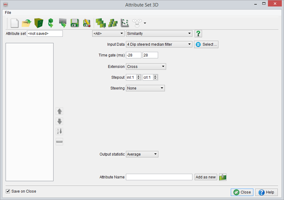 When parameters of an attribute are updated, the modified attribute can be added to the attribute set with a new Attribute name by clicking Add as new. Clicking on any other attribute in the list means that the updated parameters are accepted, while keeping the original attribute name. The Revert changes button only reverts changes to the original state before clicking on another attribute in the set. When Ok is pressed, the (updated) attribute set becomes the "active" attribute set. The attribute set is saved to disk when Save on Ok is ticked. To save an attribute set under a different name, use the corresponding option under the File menu.