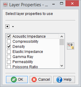 icon . To be able to generate synthetics, Density and Pwave velocity are selected by default. For the moment, it is not possible to combine properties together. So for example to get the Acoustic Impedance, you have to model the Acoustic Impedance log.
