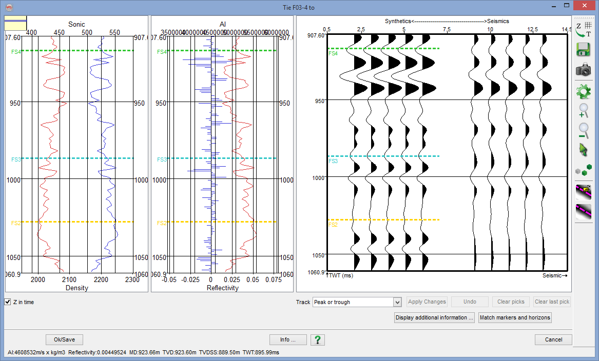 At the bottom right corner of this display panel, there are several tracking controls. The options are used to pick an event to match the seismic and synthetic traces. After picking the event, press Apply Changes to reflect the changes and update the time to depth model.