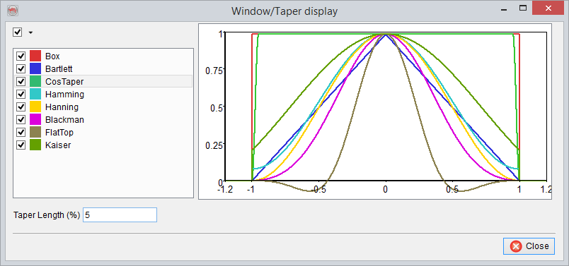 The specified time-gate is transformed to the Fourier domain and the requested output is calculated. The time-gate is tapered with the specified Window/Taper prior to Fourier Transform. The shape of the various tapers is shown in the figure below.