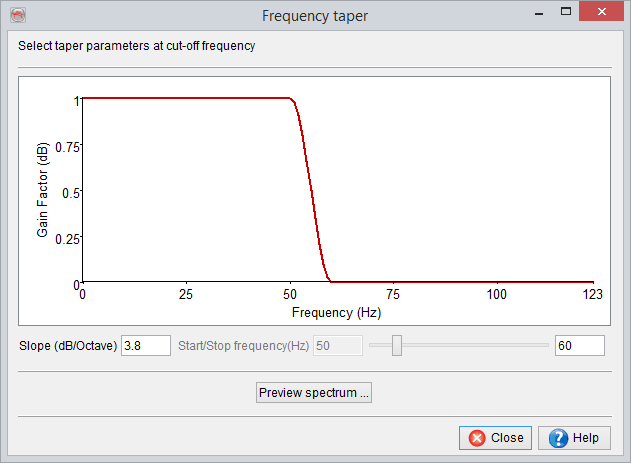 Once the Frequency Taper is displayed (red line in a pop-up window), a spectrum on any inline/crossline can be viewed by pressing the Preview Spectrum button. It will prompt to select an inline/crossline ("Select line from Data"). In that dialog select either inline or crossline radio button and press Next. Sub select the part of inline/crossline and proceed. A blue coloured amplitude spectrum will be displayed (as shown below). Now adjust the parameters (Slope or Start/Stop Frequency) and finalize the frequency taper settings.