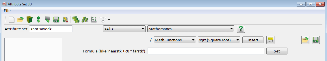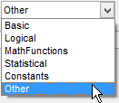 Predefined functions, constants, and operators can be inserted into the 'Formula' field using a combination of the drop-downs, followed by the 'Insert' button. These are grouped so:
