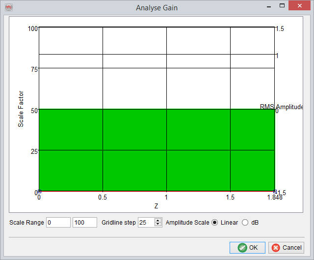 The Analyse Gain window has the 'Z' range (in seconds) of the seismic data as the horizontal axis, while the left vertical axis shows the 'Scale Factor' and the right vertical axis is the 'RMS Amplitude'. The amplitude scale can be set to 'Linear' or 'dB' (i.e. decibel) for visualization purposes. Further, the 'Scale Range' could be changed to use a different scale. The 'Gridline step' could be changed as the name says to modify the gridline steps.