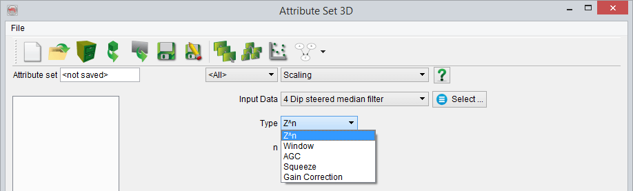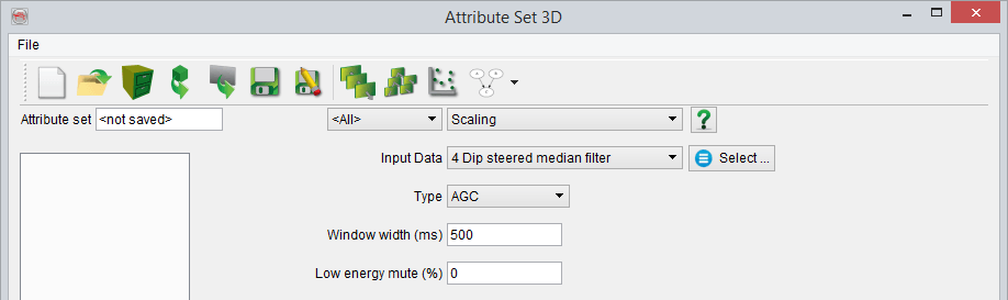 The AGC is a special case of the window scaling. In this case the window is defined relative to the actual sample and the "basis" is the energy value in that sliding window. The window width is a total size, i.e. the relative width corresponds to +/- half of the total window width. The low energy mute will mute the output samples that have an energy lower than a ratio of the trace energy distribution: The energy of the input trace is computed and the output values are sorted per increasing energy value.
