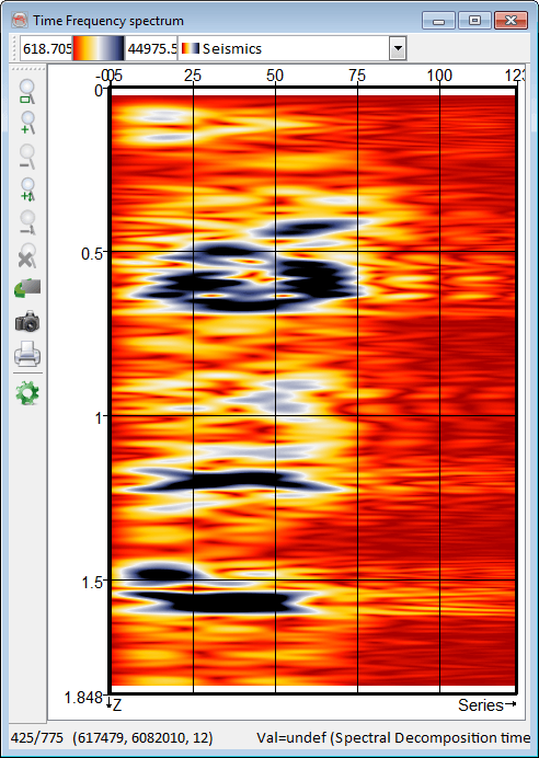 The output frequency is best determined using the time-frequency spectrum panel. This panel displays the spectral decomposition output for all frequencies between 0 and the Nyquist frequency of the data, computed with a step of 1Hz. One must first select a position for this single trace analysis: