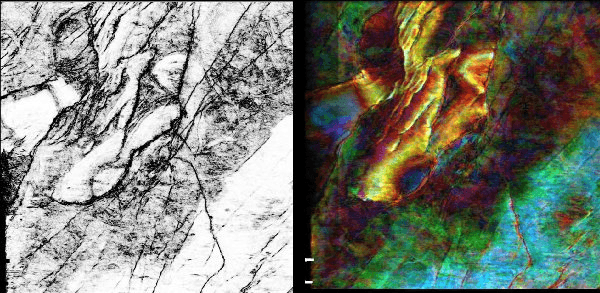 A color blended map view (image on right) of the spectral decomposition (red-10hz, green-20Hz, blue-40hz). Compare the results with the coherency map (image on left). Note that the yellowish colored fault bounder region is thicker as compared to the surrounding regions. The faults throw (red-color) are also clearly observable. Coherency/similarity together with color blended spectral images can reveal better geological information.